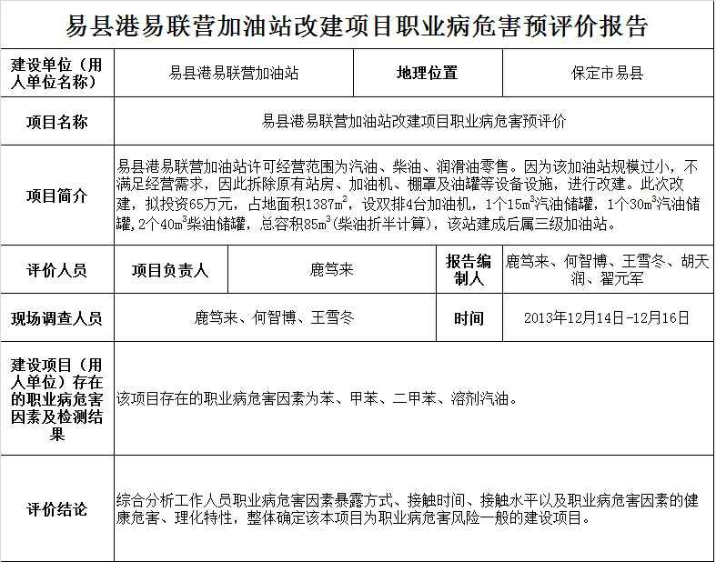 易县港易联营加油站改建项目职业病危害预评价